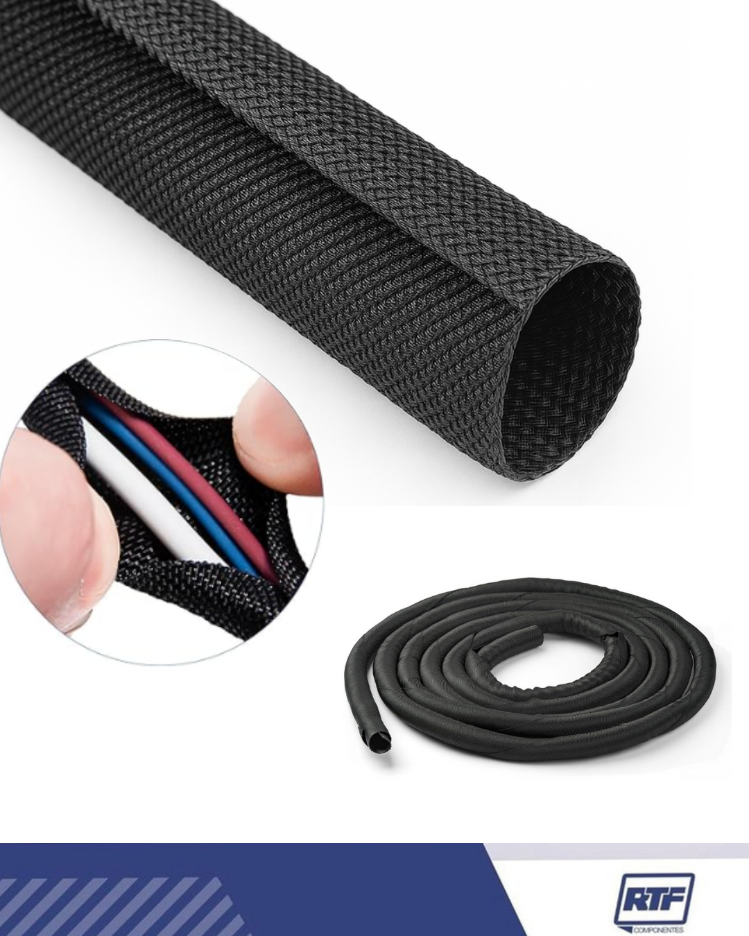 Malha profissional RTF Componentes, malha autofechamento é sinônimo de solução rápida e inteligente para revestimento de cabos e chicotes elétricos em geral. Material utilizado amplamente por industrias automotivas, automação industrial, montagens elétricas, painéis elétricos, som automotivo, mangueiras de arrefecimento, Offshore, umbilicais de mergulho, dentre outras aplicações. Recomendado para soluções em áreas de degradação a longo prazo, sendo necessária a inspeção de manutenção a médio prazo, facilitando a abertura e troca dos mesmos;
